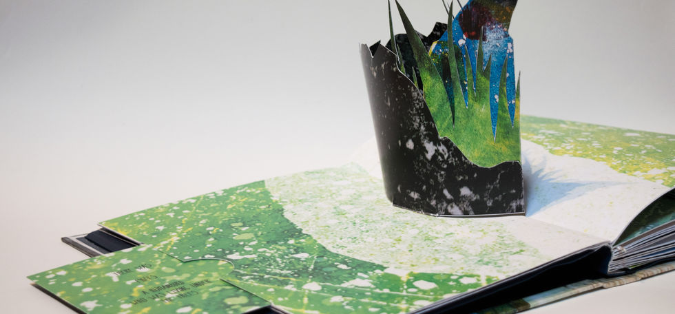 meccanismi pop up e composizione del libro interamente realizzati e rilegati a mano. Le texture e i personaggi sono monotipi digitalizzati e modificati.